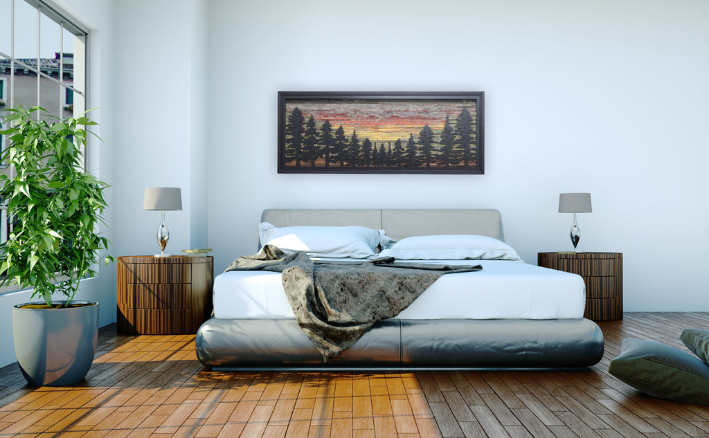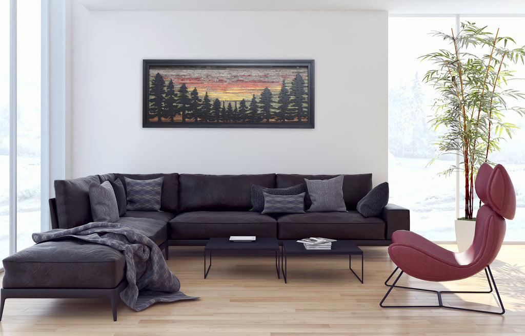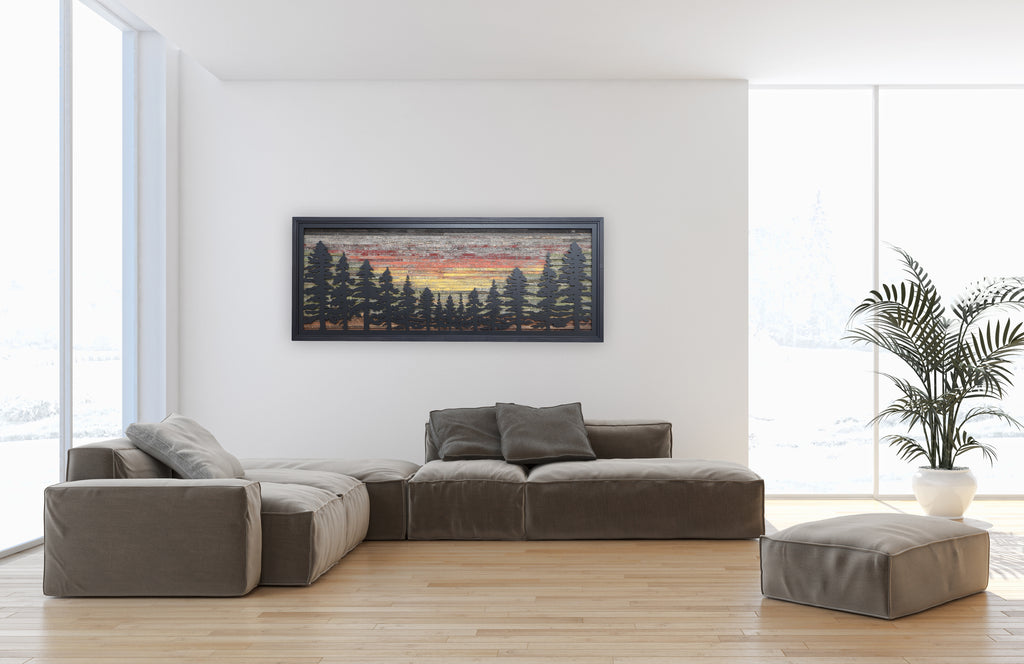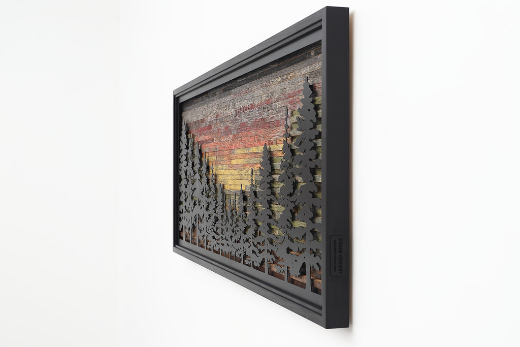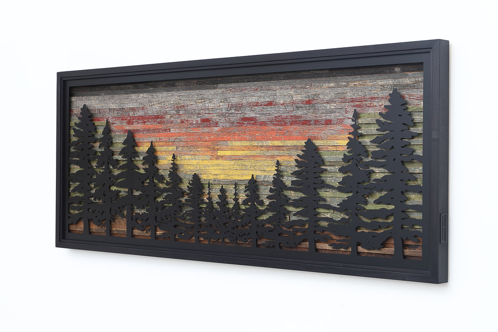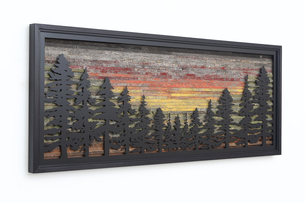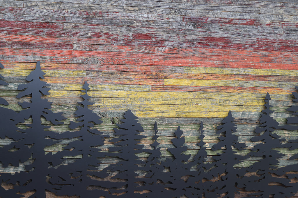 This art piece is a combination of old reclaimed wood and a Pine tree sculpture that is cut from 1/16" thick metal painted in Matte black finish.