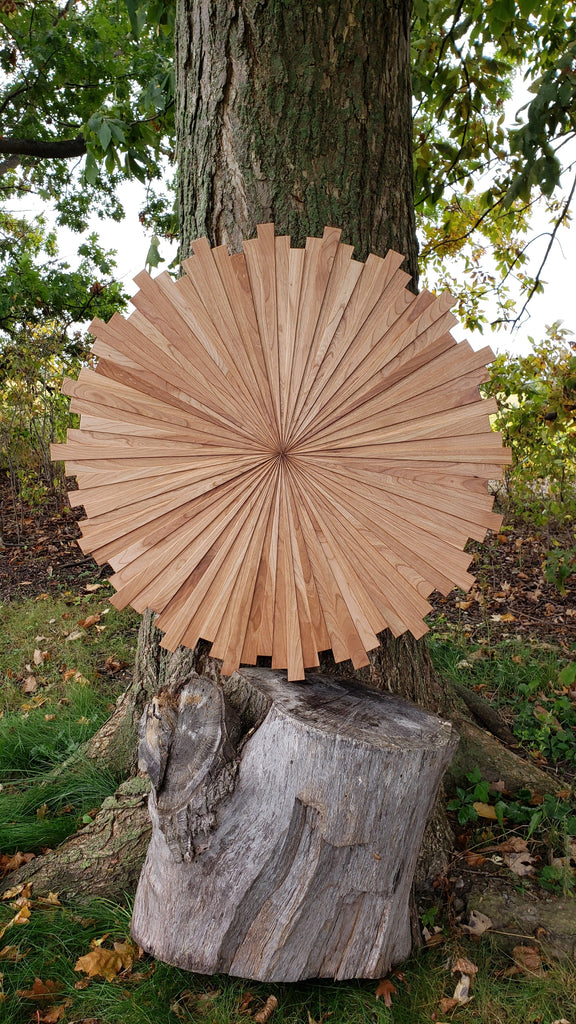 This Starburst artwork is made of Natural Cherry hardwood. I sprayed one coat of low VOC water base sealer in satin finish to preserve the beauty of the wood.