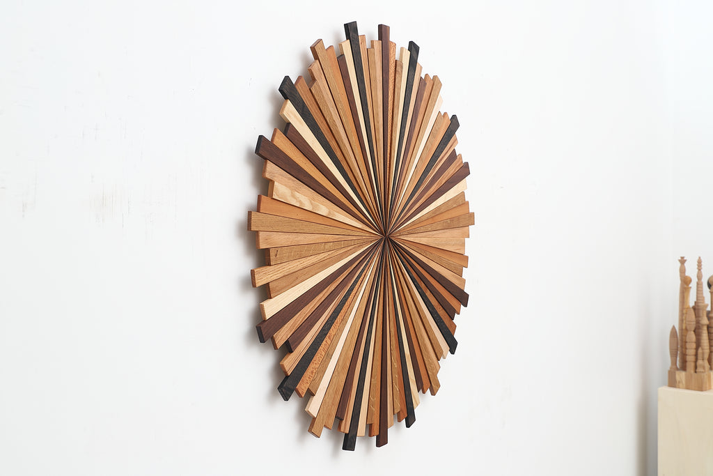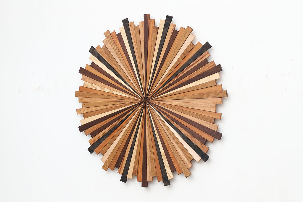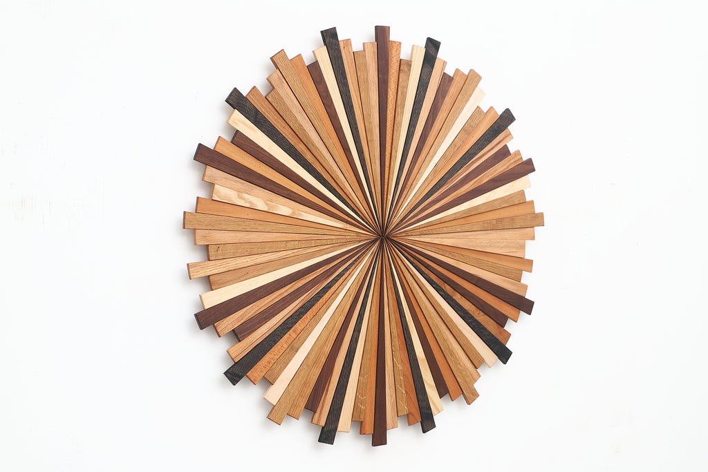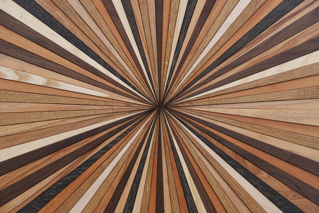 This Starburst artwork is made of Multiple species of natural hardwood to give the piece its variation in color. Species of wood include White Oak, Maple, White Ash, Black Walnut, Hickory, Cherry, Mahogany and a few dark ebonized stained pieces to give a piece a little contrast. The finish I used on this piece is Natural food grade finish, linseed oil and beeswax mix, this is what gives the piece a warm amber finish.