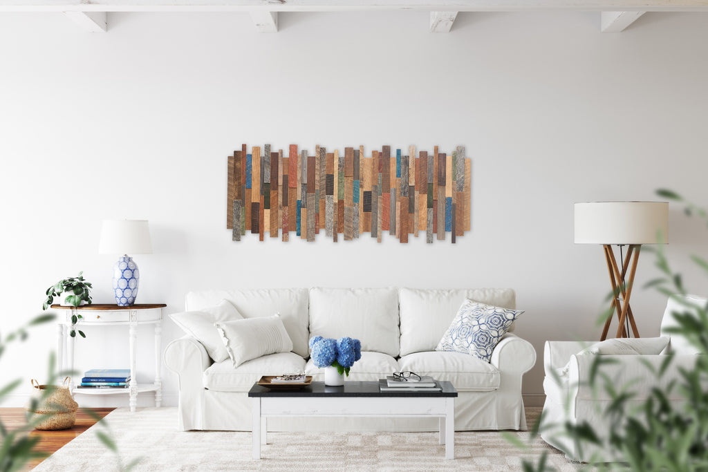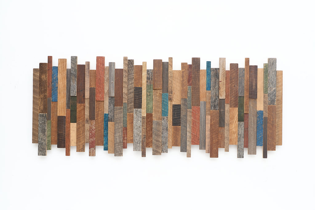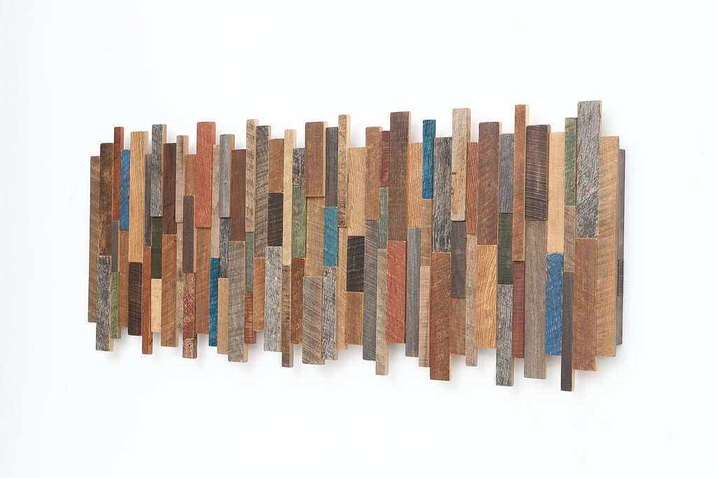This artwork is constructed from old reclaimed local barnwood. The artwork consists of multiple species of wood with various colors and weathering. There is hints of blue, green, red and burnt orange weathered painted pieces. I do my best to make it look similar to the one in the photo.
